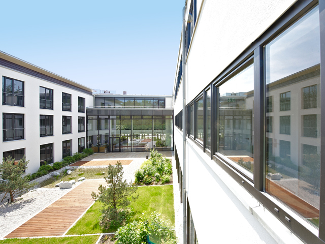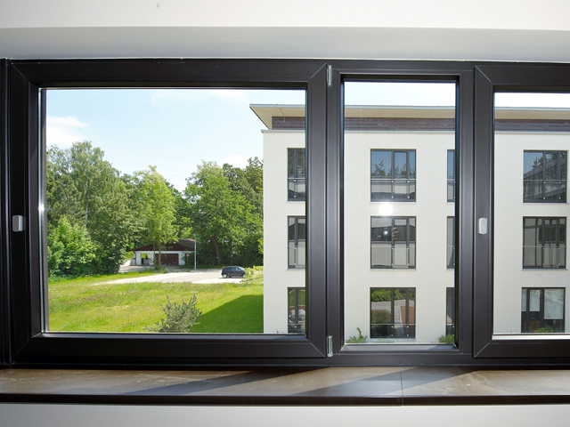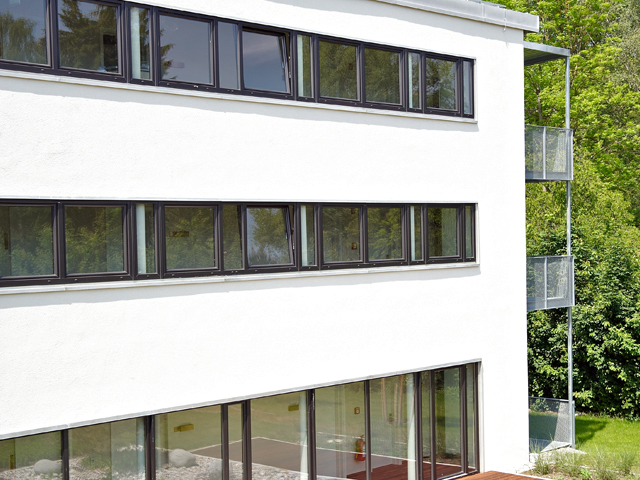Schlichte Eleganz in Kombination mit edlen Materialien: So präsentiert sich das 4-Sterne Hotel >fürstenfelder<. Die Fenster fügen sich mit ihrer glänzenden Optik und der feinen Oberflächenstruktur hervorragend in die Architektur des Gebäudekomplexes ein. Der grau durchgefärbte Profilkörper harmoniert bestens mit der Farbe Graphit Schwarz aus den ›Architecture Colors‹.