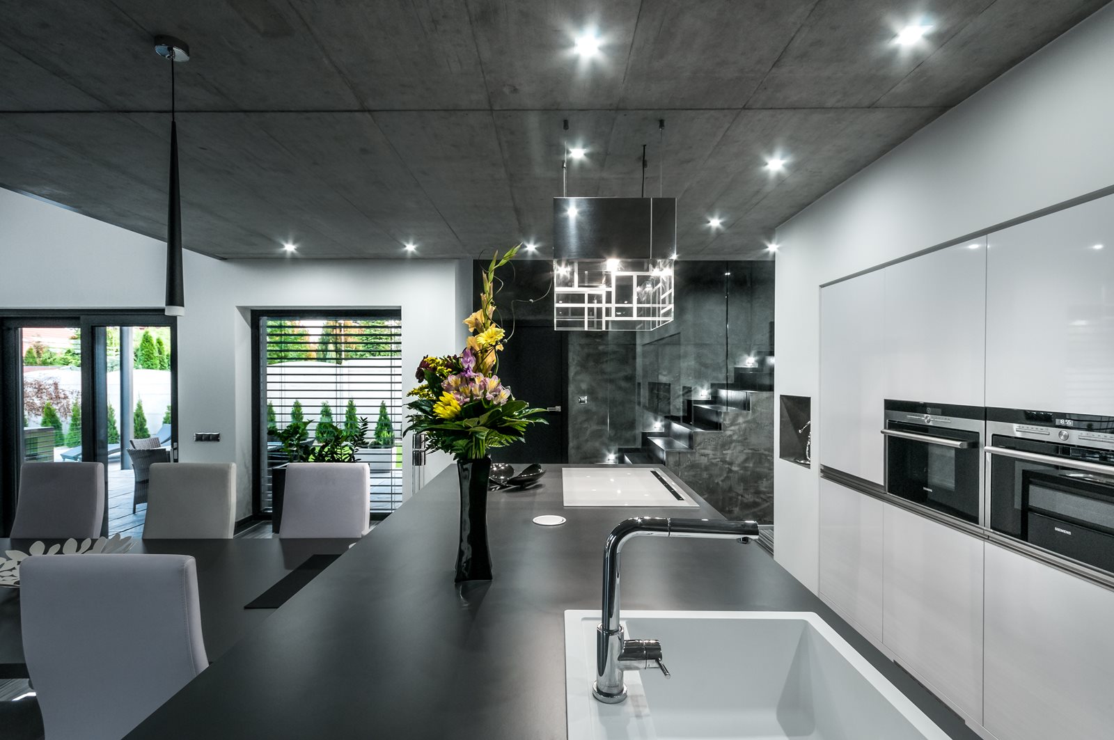 Generously dimensioned windows (3.5 x 2.4 m and 4.5 x 1.3 m) characterise the architecture of this building. Frameless all-glass solutions with glass-on-glass corner windows and generous lift and sliding doors – everything to passive house standard – provide plenty of daylight and an airy atmosphere. The Eforte window profiles used can support several hundred kilos of glazing without any problem. The anthracite-coloured decor is in perfect harmony with the colouring of the façade and the metal roof.